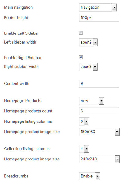 Layout - alows to setup main website blocks. Sidebars width, main content width, product listing settings etc.
